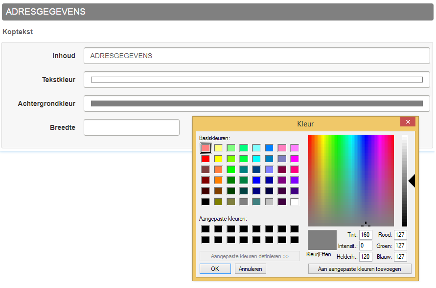 De Koptekst velden dienen als hoofdstuk titels om de volgende set van invoervelden te kenmerken zoals adresgegevens, werkzaamheden, materialen, enz. Voor zowel de tekst als de achtegrond kan er een kleur ingevoerd worden.