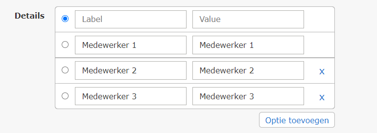 Met de Optie toevoegen kunnen nieuwe optie keuzes toegevoegd worden. Het rode kruis verwijdert de optie.