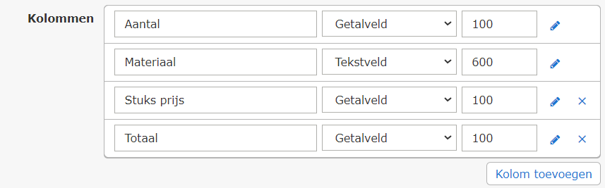 Standaard bestaat een tabel uit 3 kolommen. Deze kunt u uitbreiden middels de knop: Kolom Toevoegen.