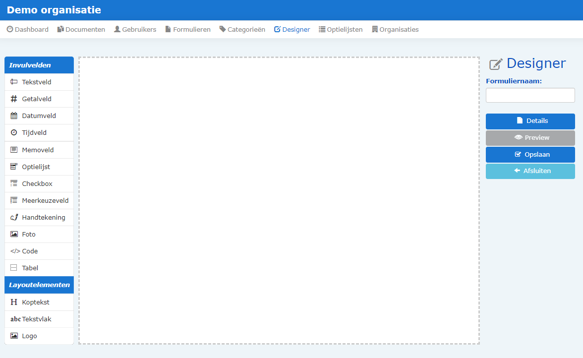 Met het Logo veld kan men een afbeelding bestand (jpeg / png / bmp) in het formulier toevoegen. Kies een bestand en deze wordt direct in het designervlak getoond. De afbeelding wordt geschaald naar een maximale hoogte van 80px en maximale breedte van 890px. Het is ook mogelijk een afbeelding met logo en adres gegevens te gebruiken, of onderaan aan het formulier de gegevens en certificeringen te tonen.